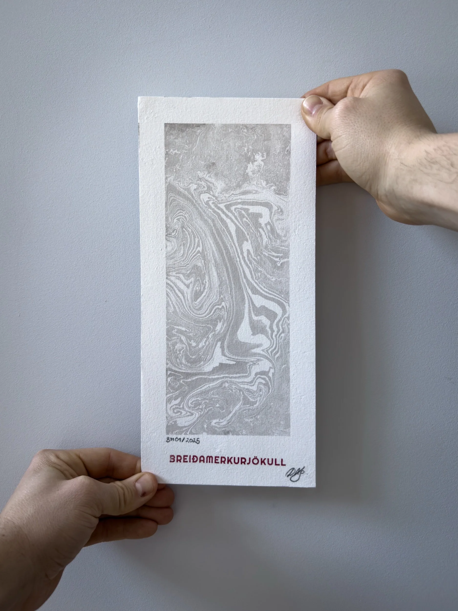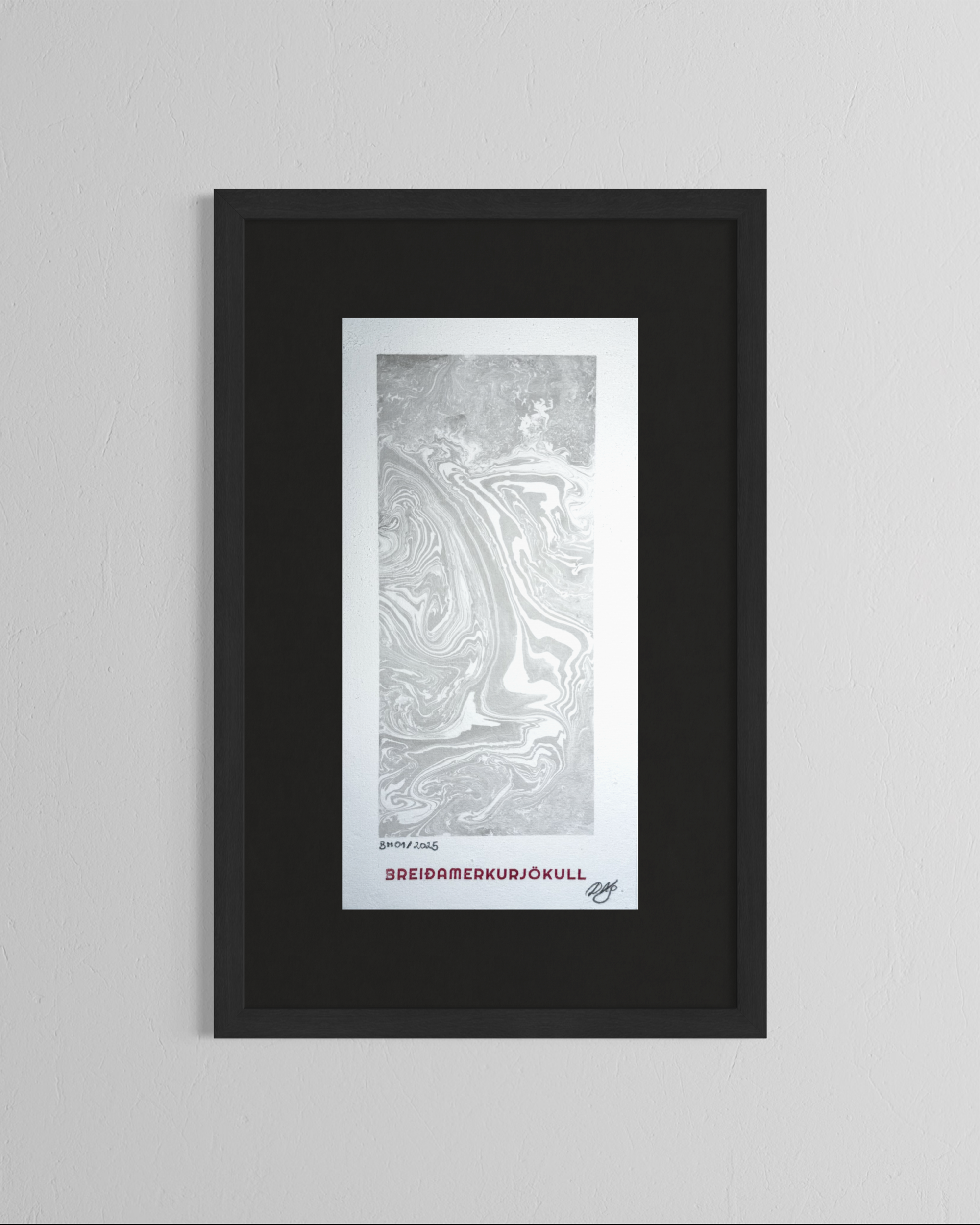 This artwork was created directly on the surface of Breiðamerkurjökull in Iceland, using glacier meltwater and natural ink made from vegetable soot. The print captures a brief moment when ink and water met on the ice, shaped by hand, wind, and time.