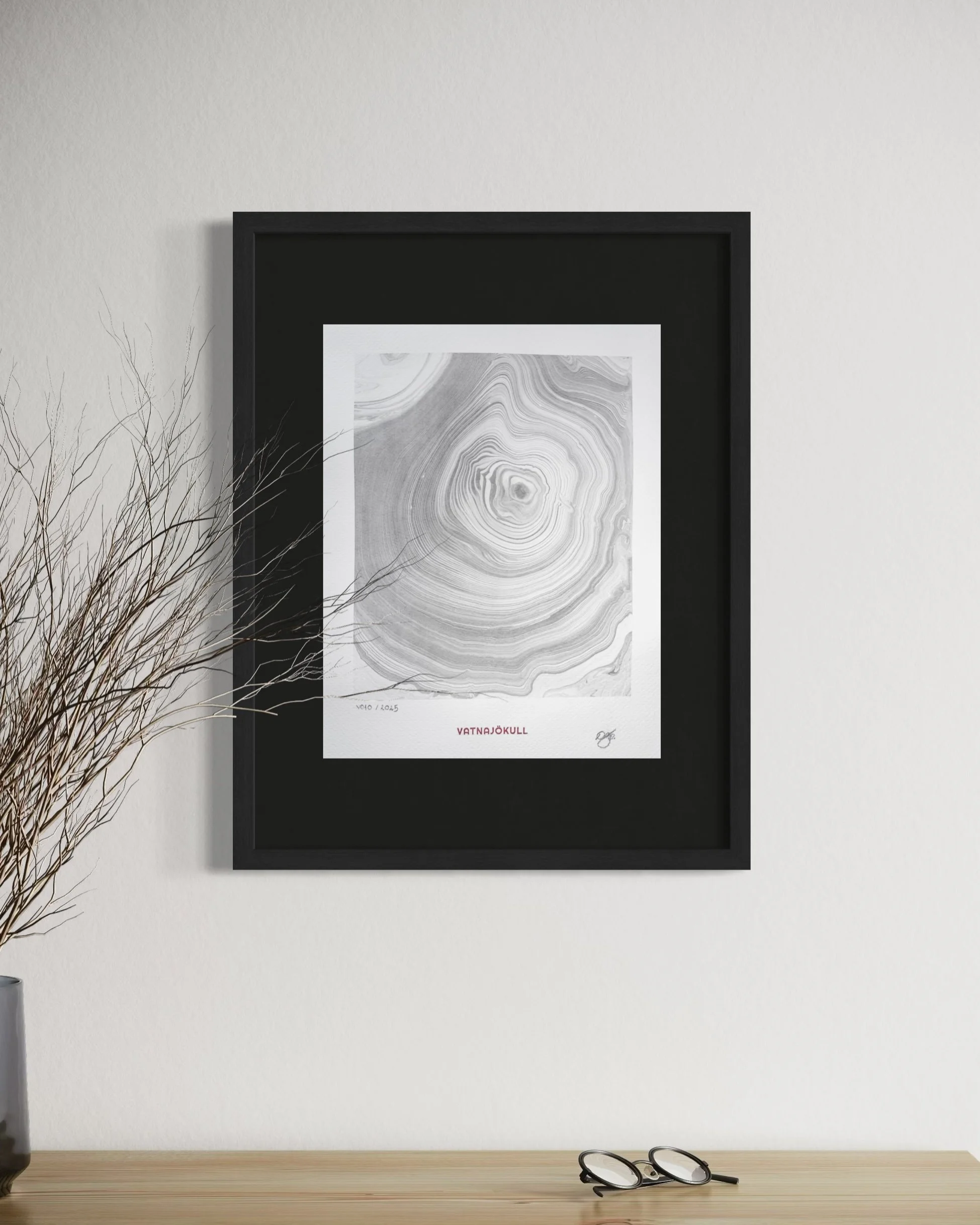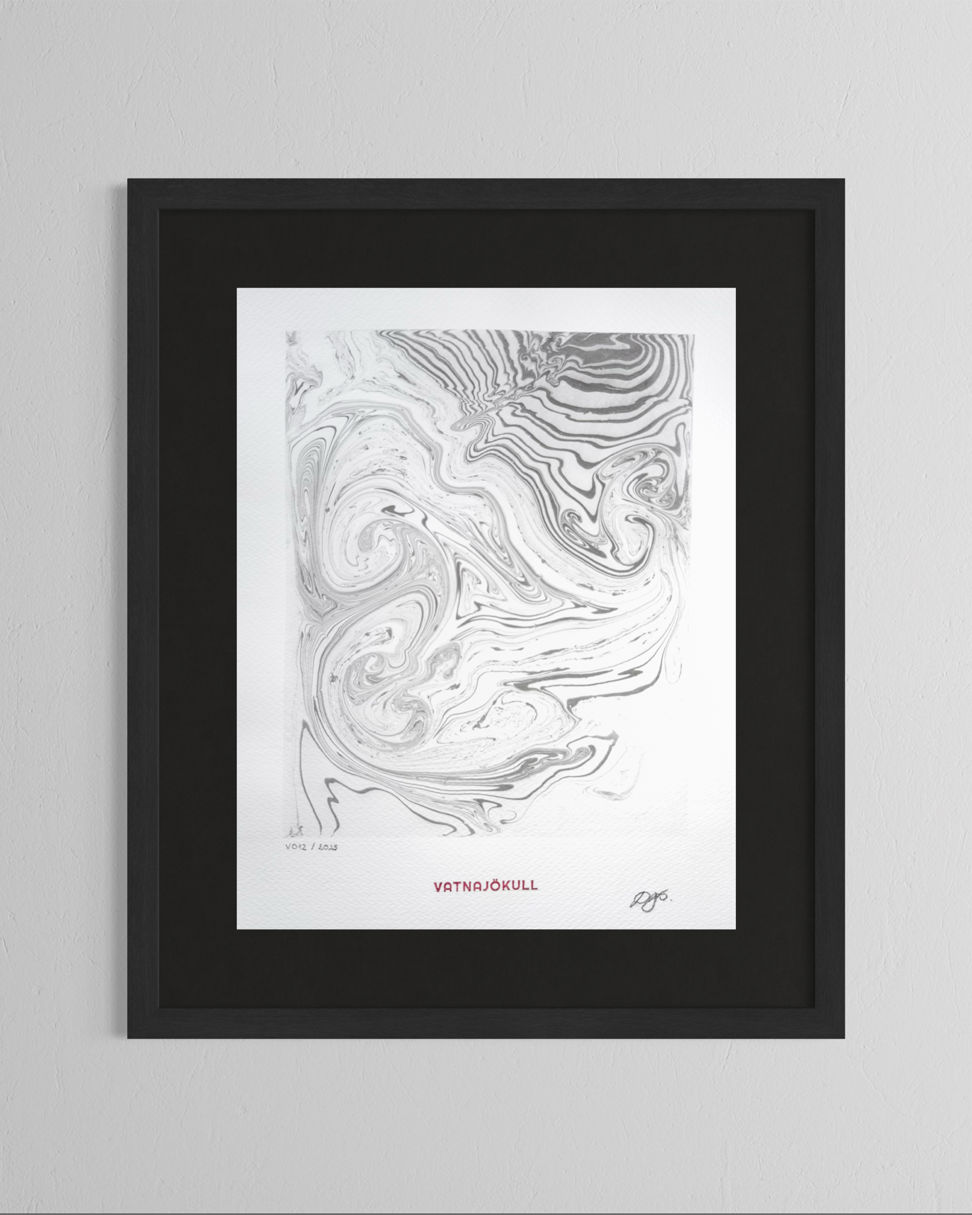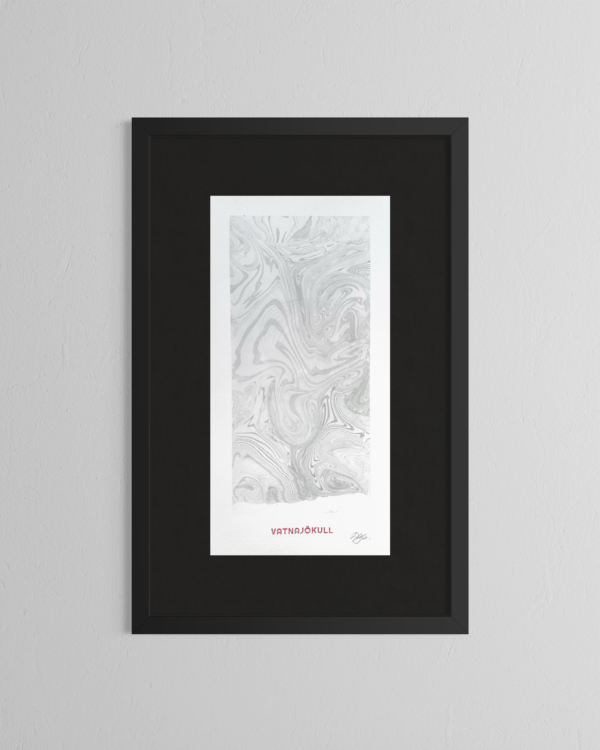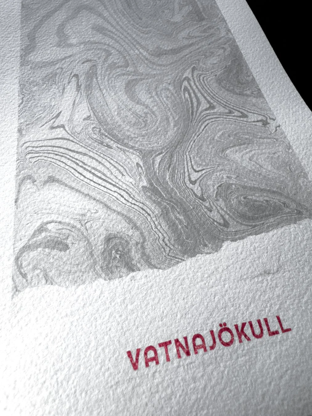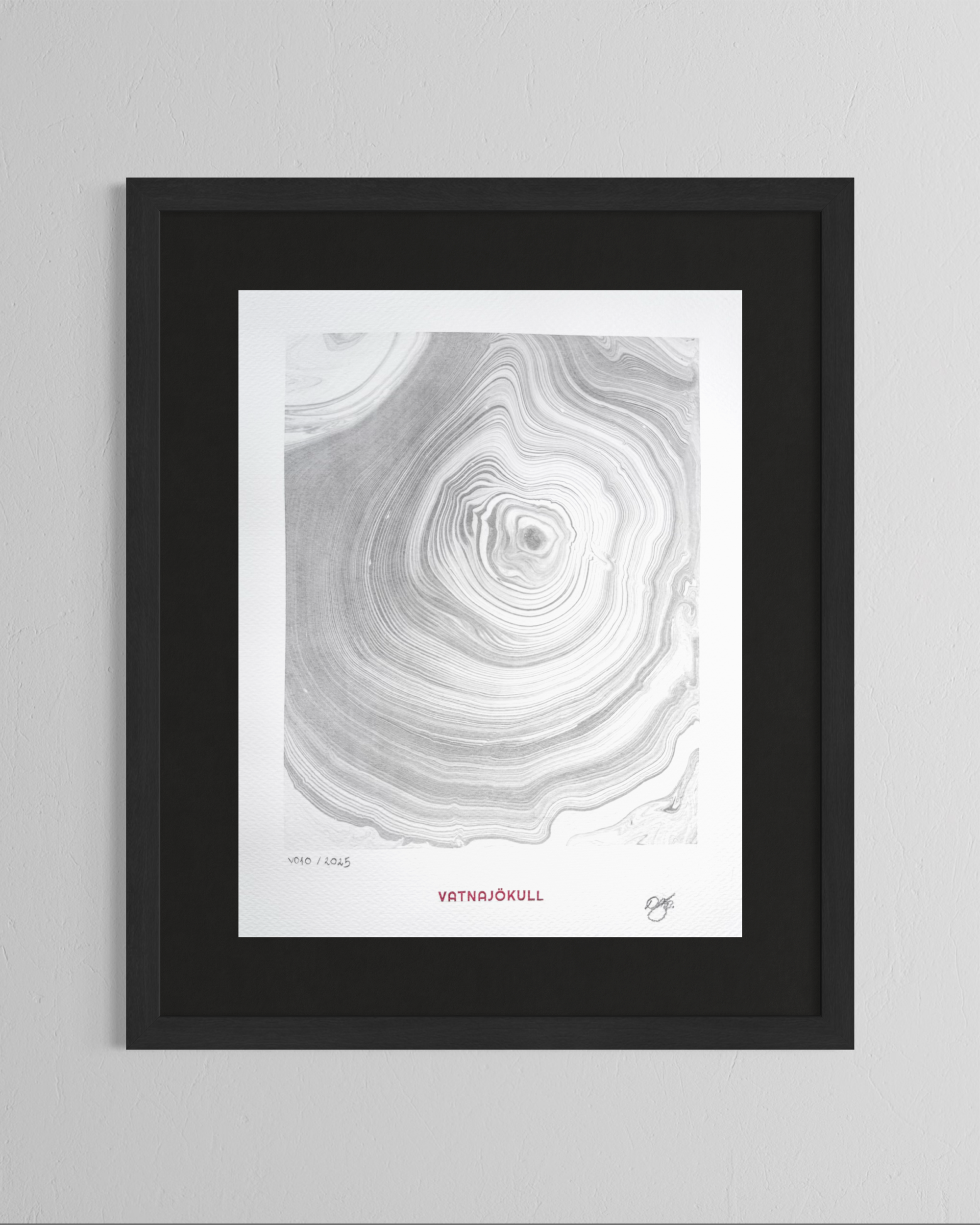 This artwork was created directly on the surface of Vatnajökull in Iceland, using glacier meltwater and natural ink made from vegetable soot. Within a floating frame, ink moves across meltwater gathered on the ice, guided by hand, wind, and time before being transferred to paper.