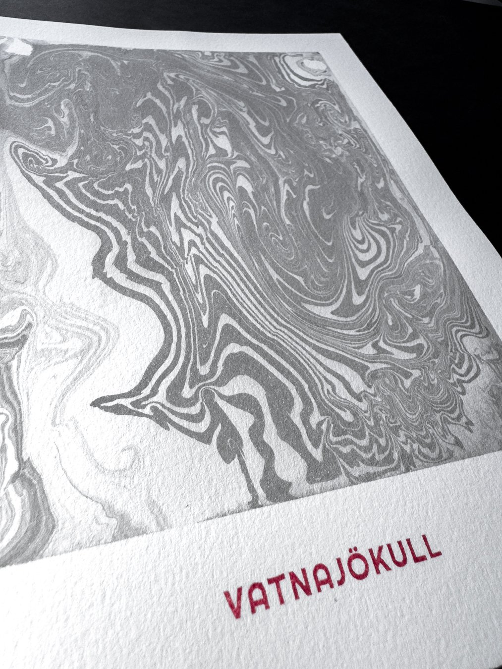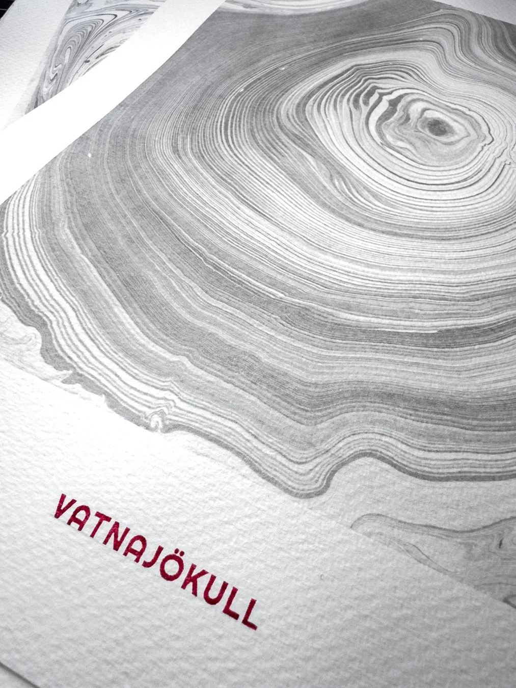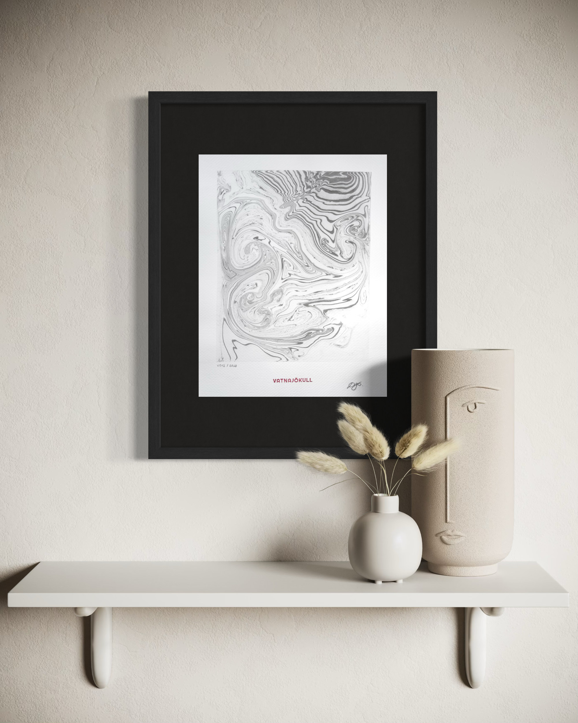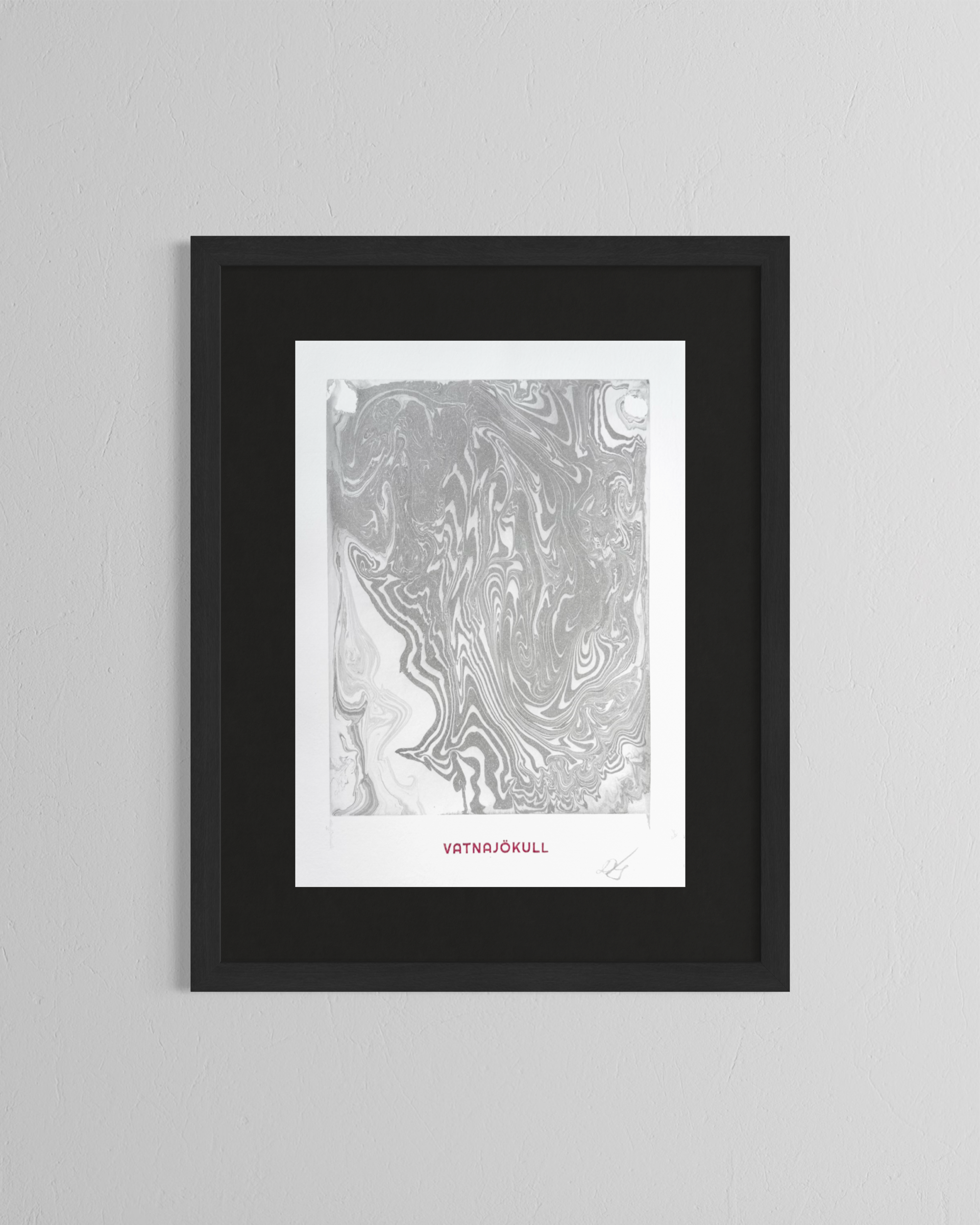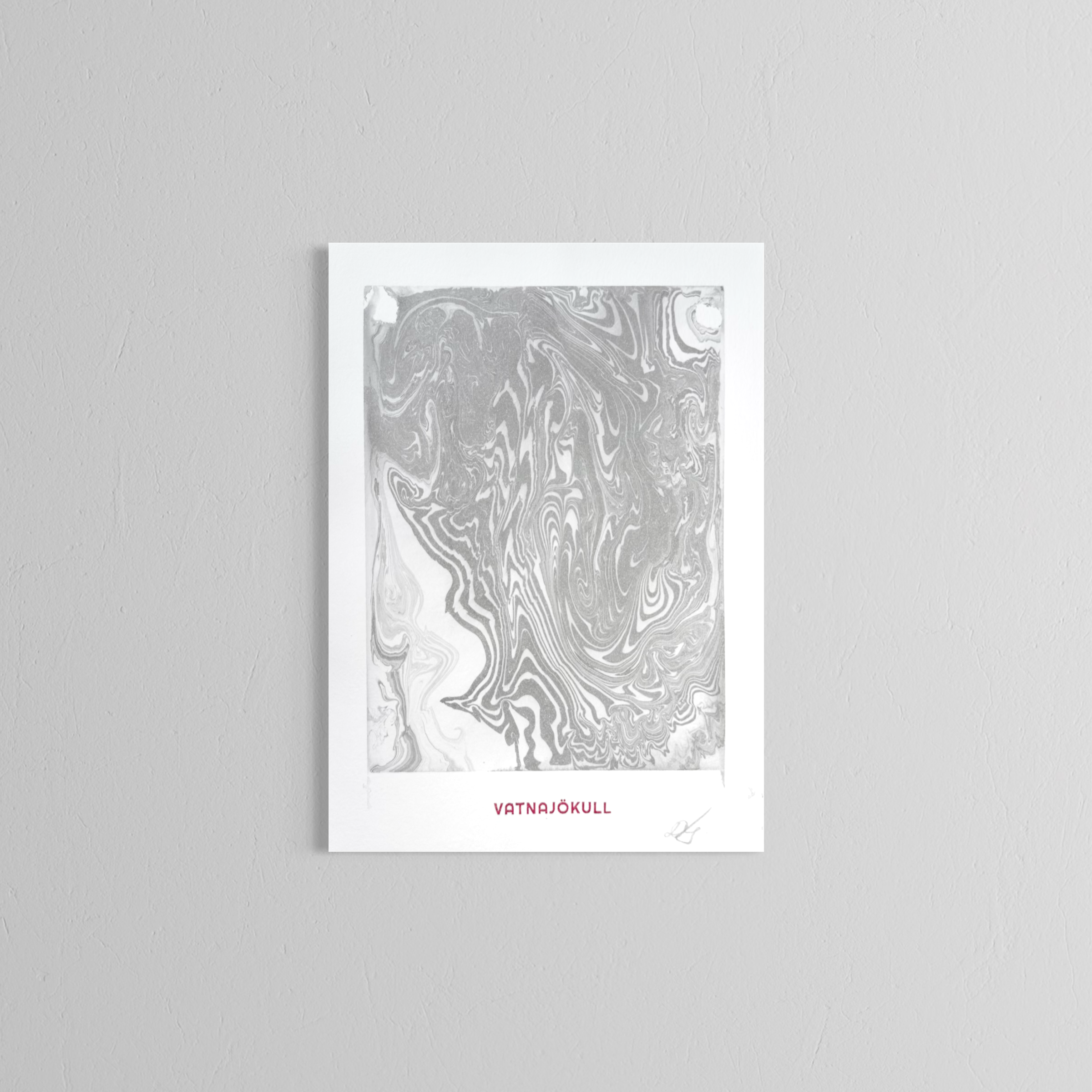 This artwork was created directly on the surface of Vatnajökull in Iceland, using glacier meltwater and natural ink made from vegetable soot. Within a floating frame, ink moves across meltwater gathered on the ice, guided by hand, wind, and time before being transferred to paper.